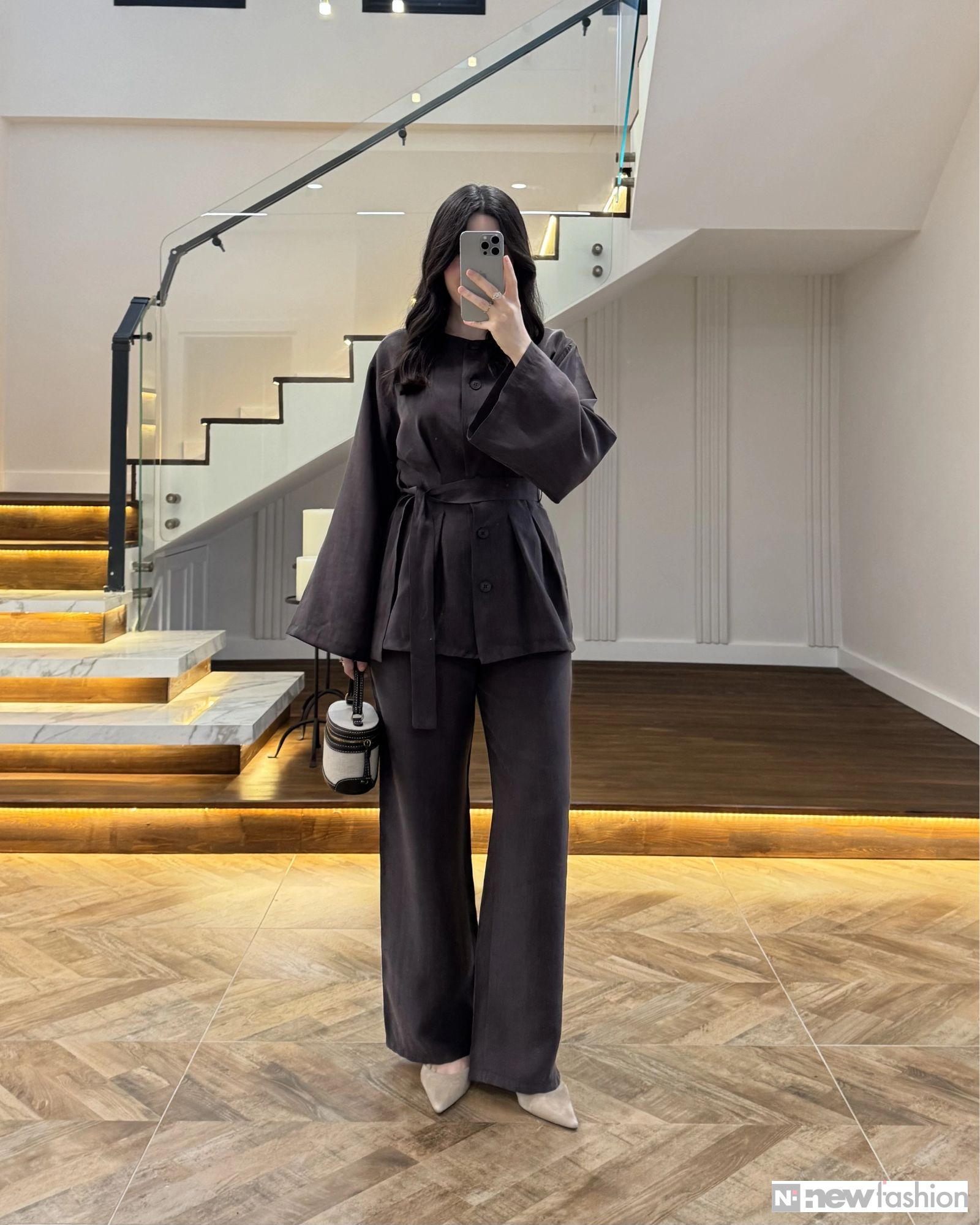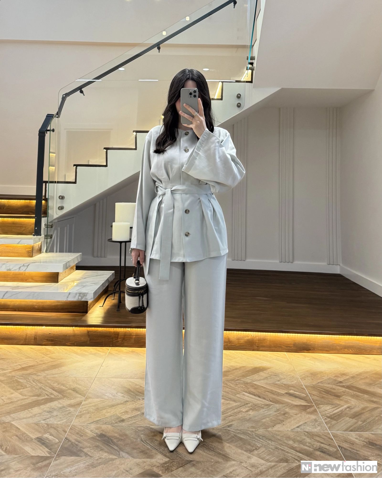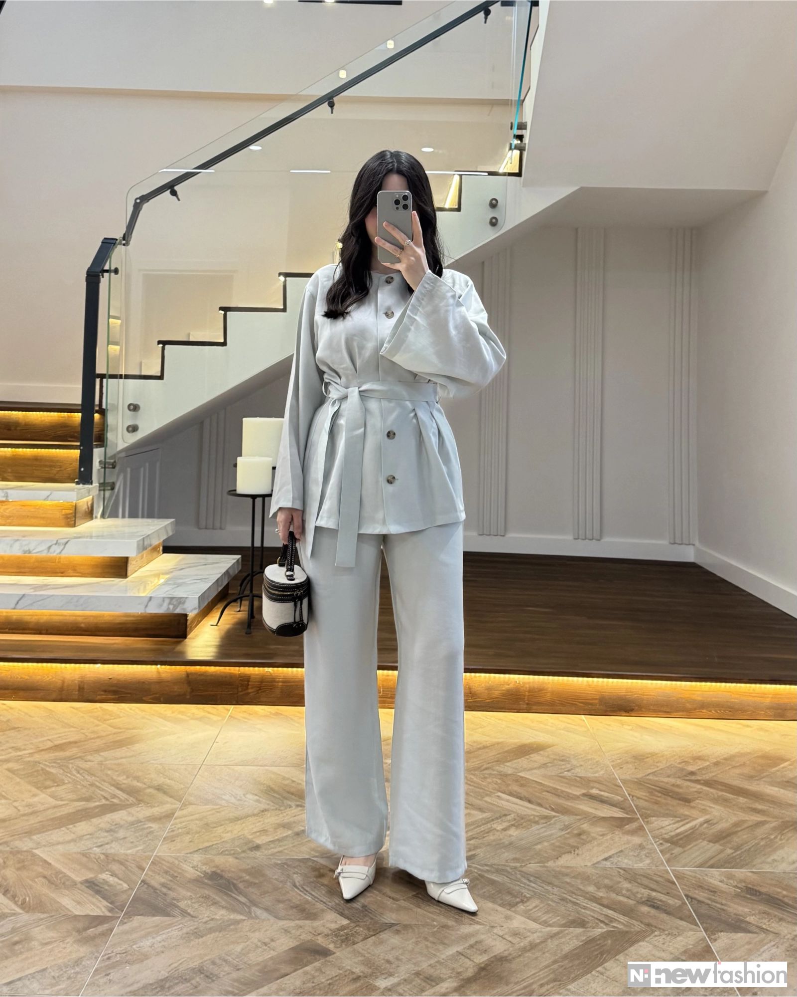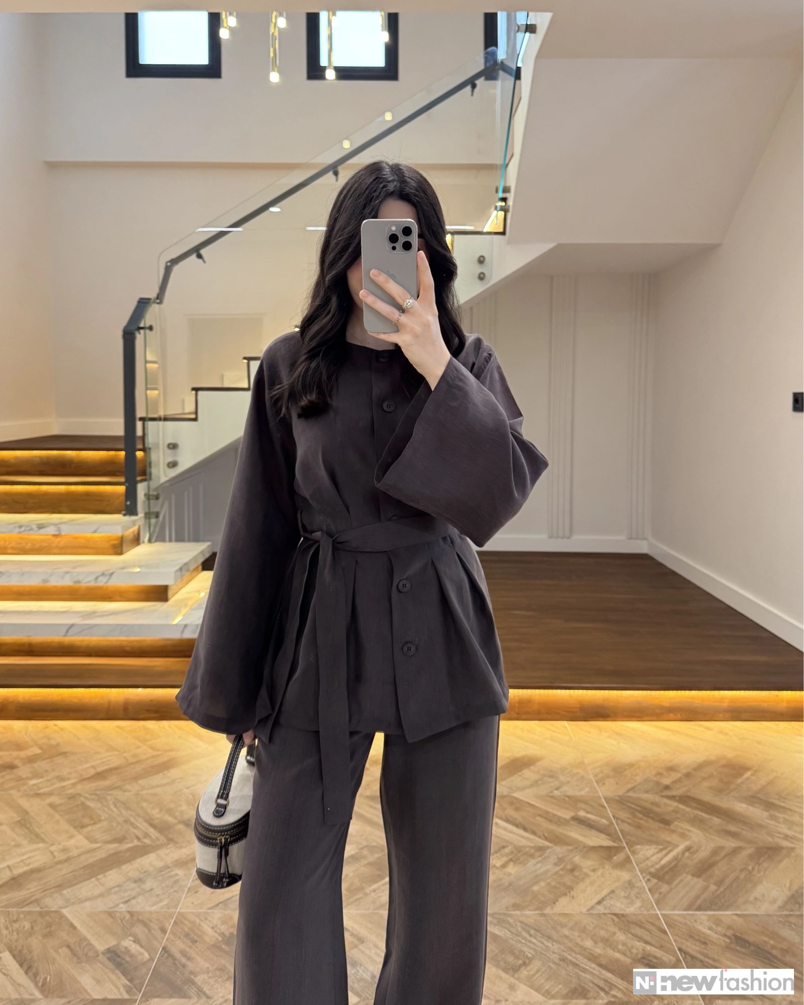 - القطعة العلوية: قميص أنيق مزود بأزرار أمامية عملية، وأكمام واسعة تمنحك حرية الحركة وشعوراً بالراحة، بالإضافة إلى حزام قماشي متناسق يمكن ربطه ليبرز جمال الخصر ويضفي لمسة أنثوية راقية.