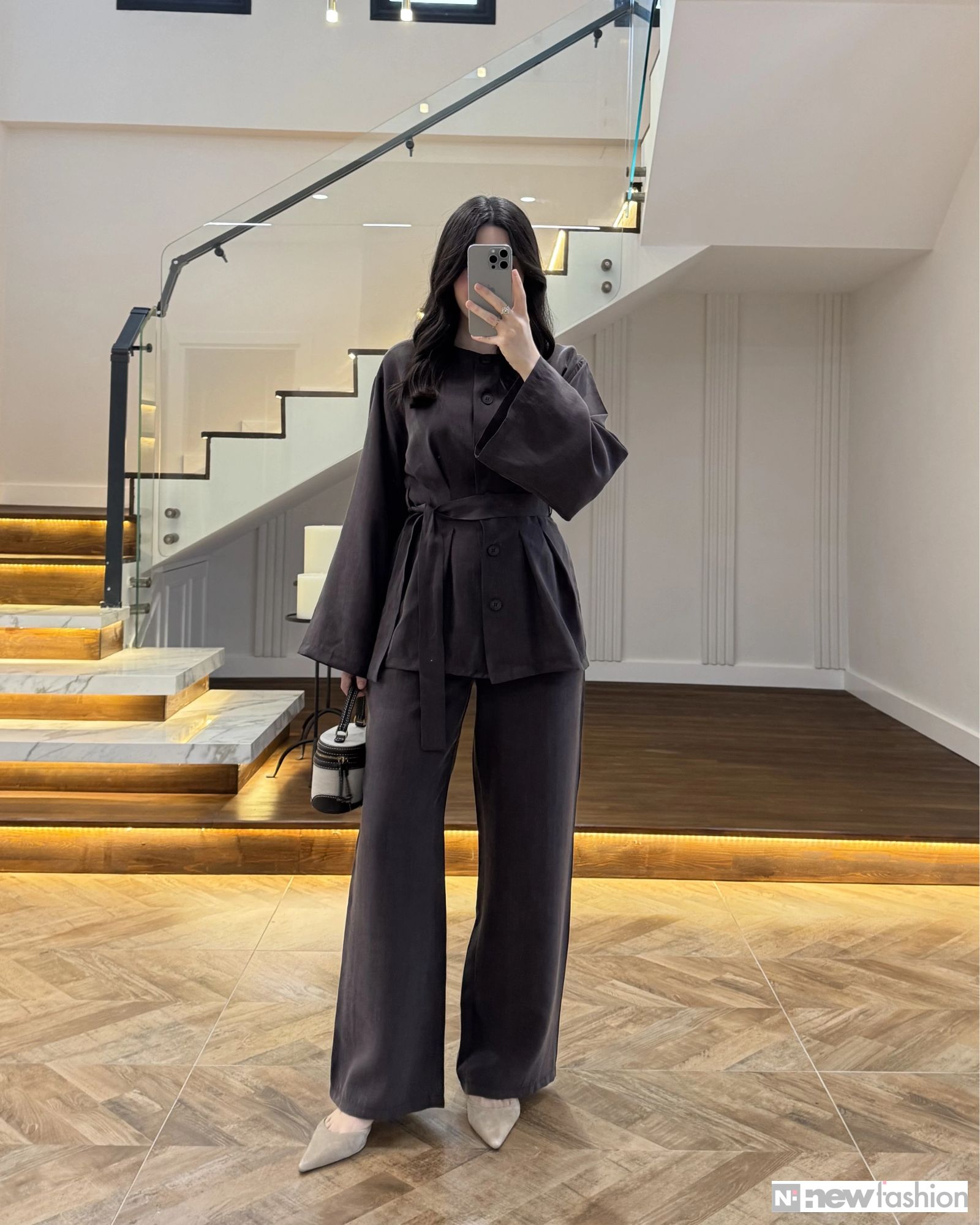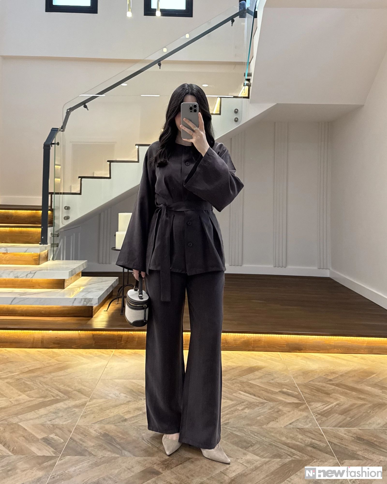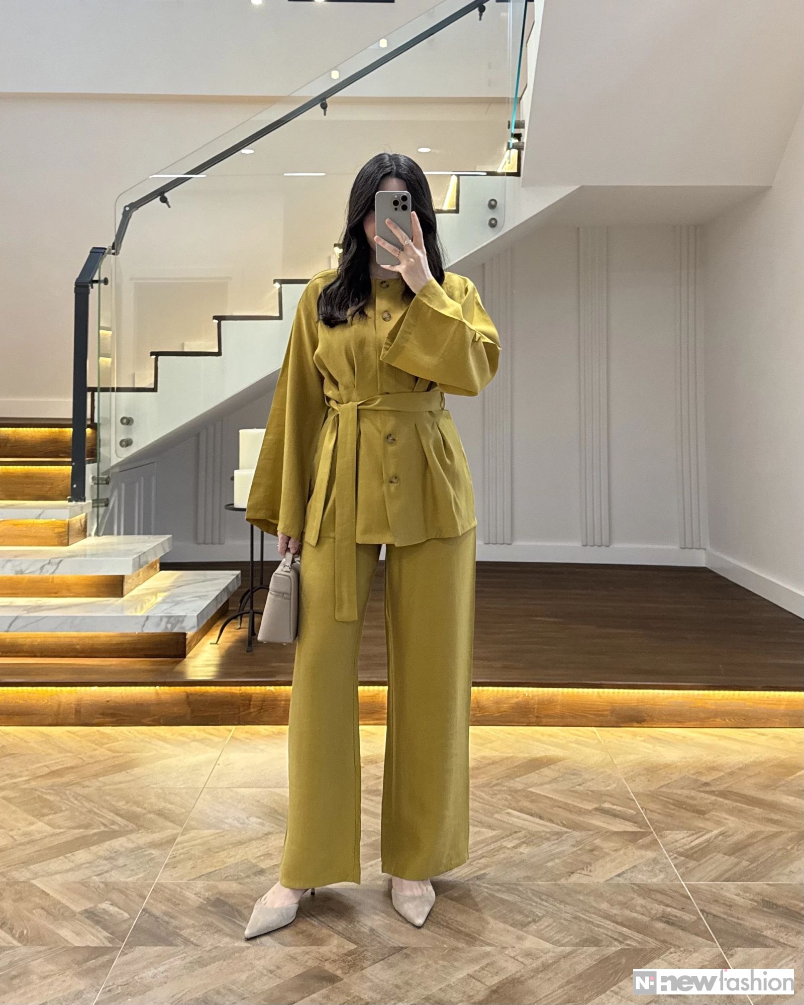- القطعة العلوية: قميص أنيق مزود بأزرار أمامية عملية، وأكمام واسعة تمنحك حرية الحركة وشعوراً بالراحة، بالإضافة إلى حزام قماشي متناسق يمكن ربطه ليبرز جمال الخصر ويضفي لمسة أنثوية راقية.