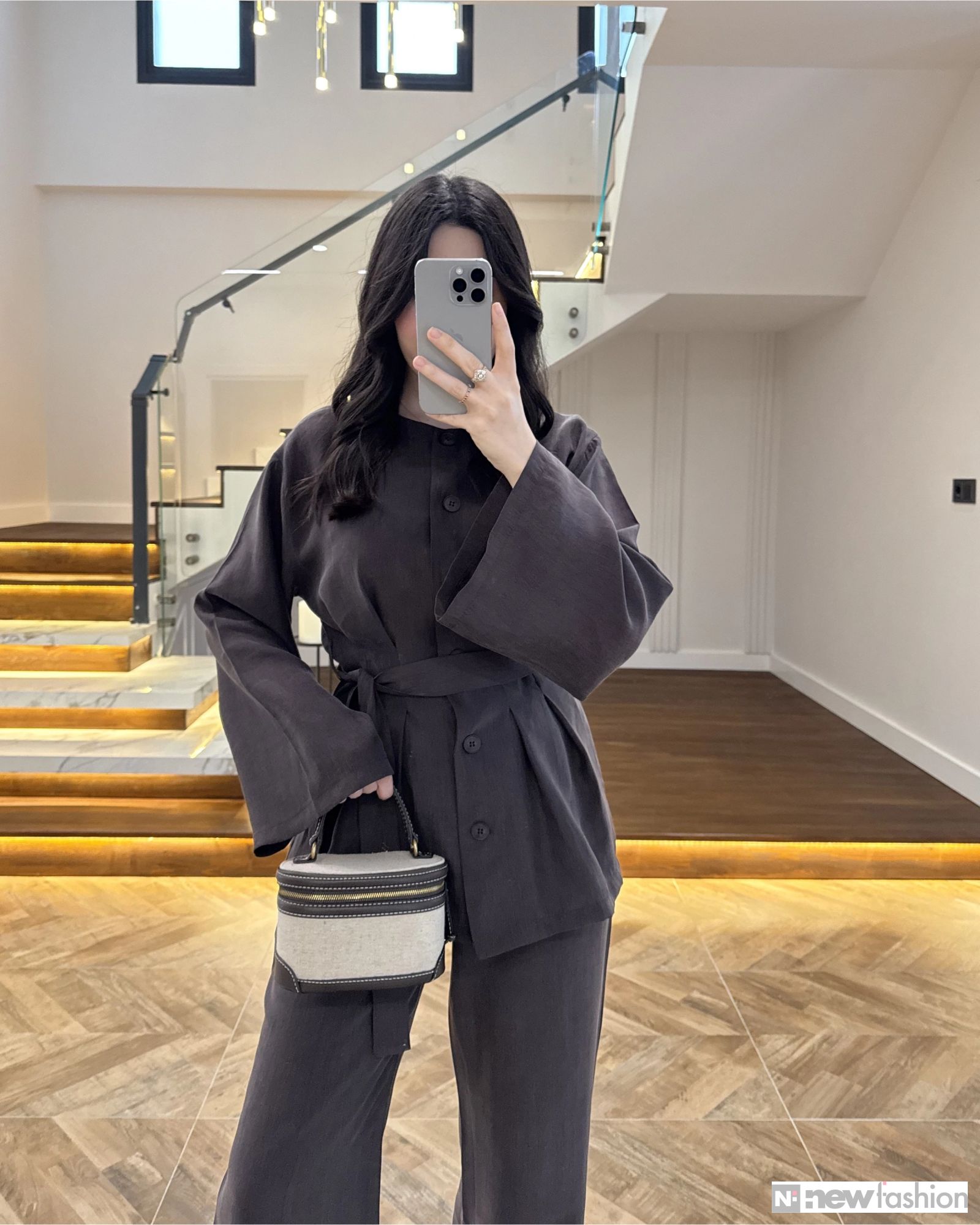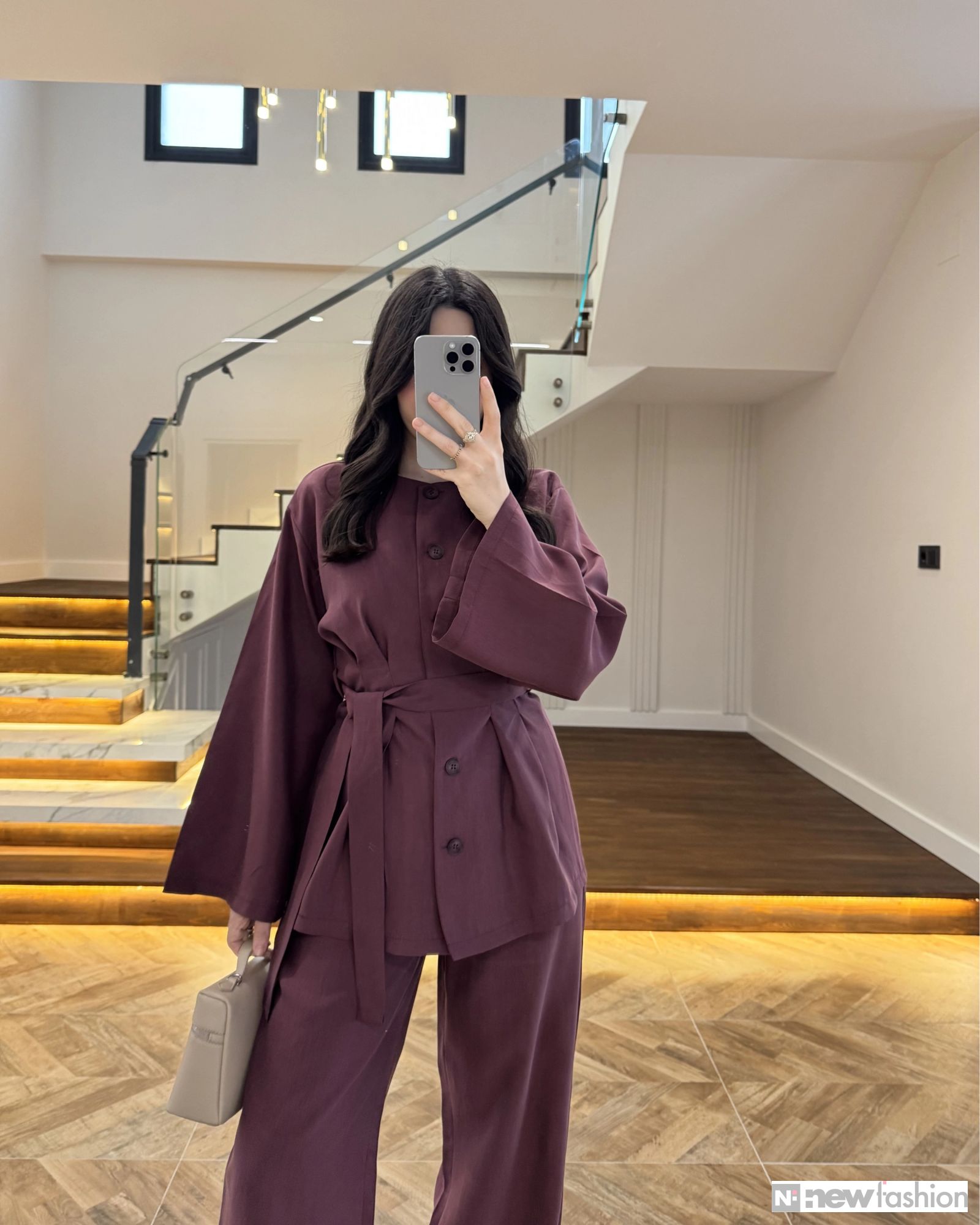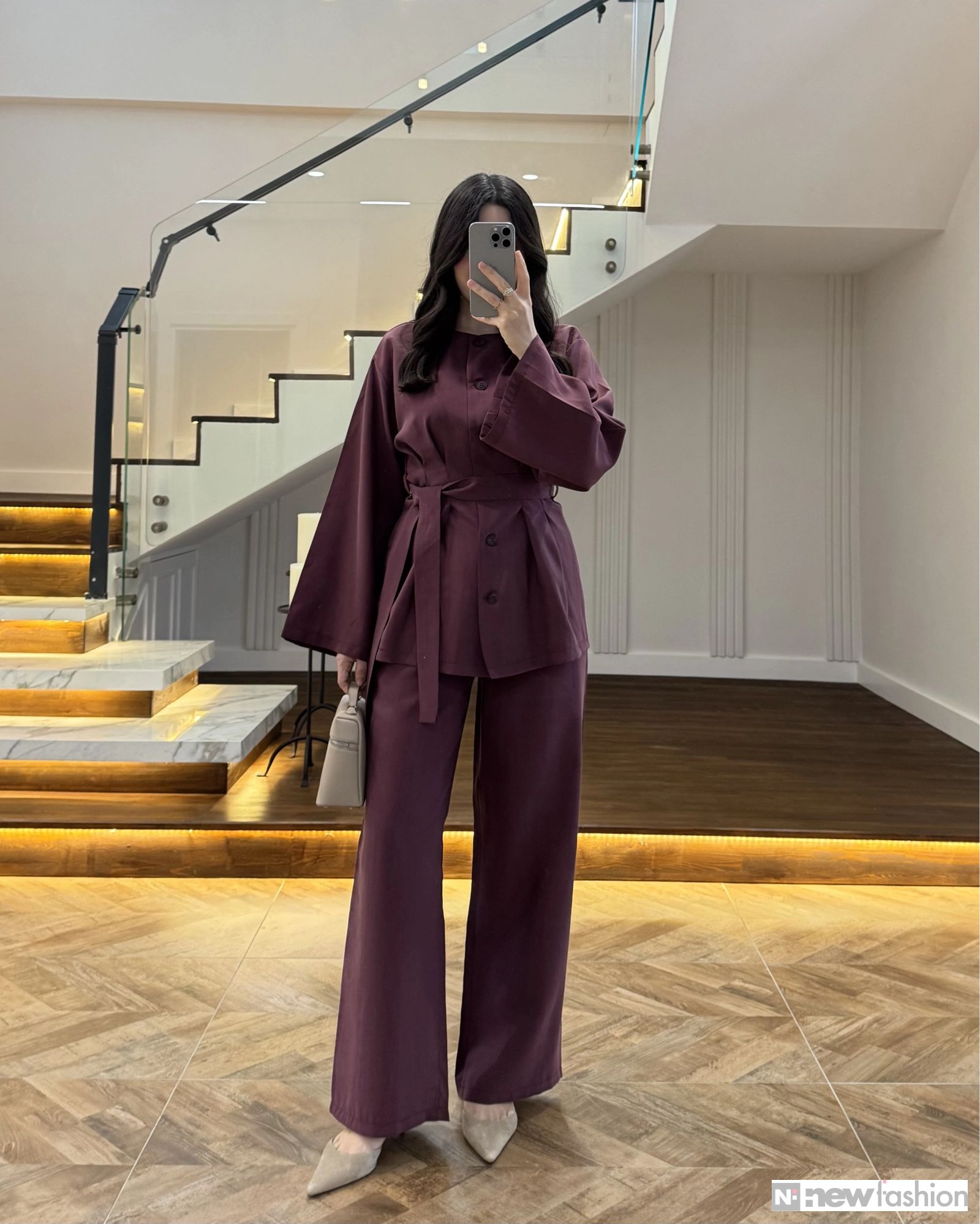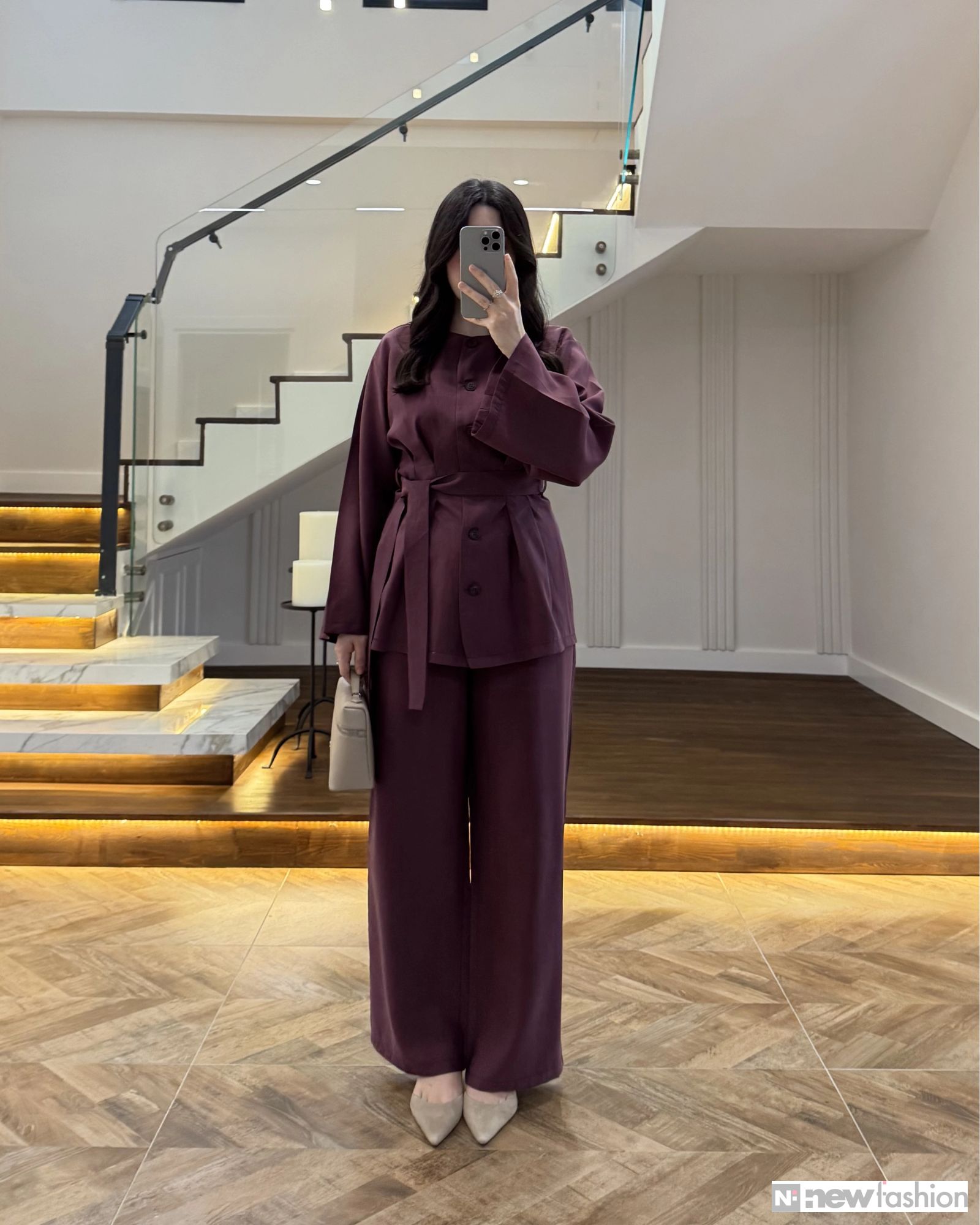 - القطعة العلوية: قميص أنيق مزود بأزرار أمامية عملية، وأكمام واسعة تمنحك حرية الحركة وشعوراً بالراحة، بالإضافة إلى حزام قماشي متناسق يمكن ربطه ليبرز جمال الخصر ويضفي لمسة أنثوية راقية.