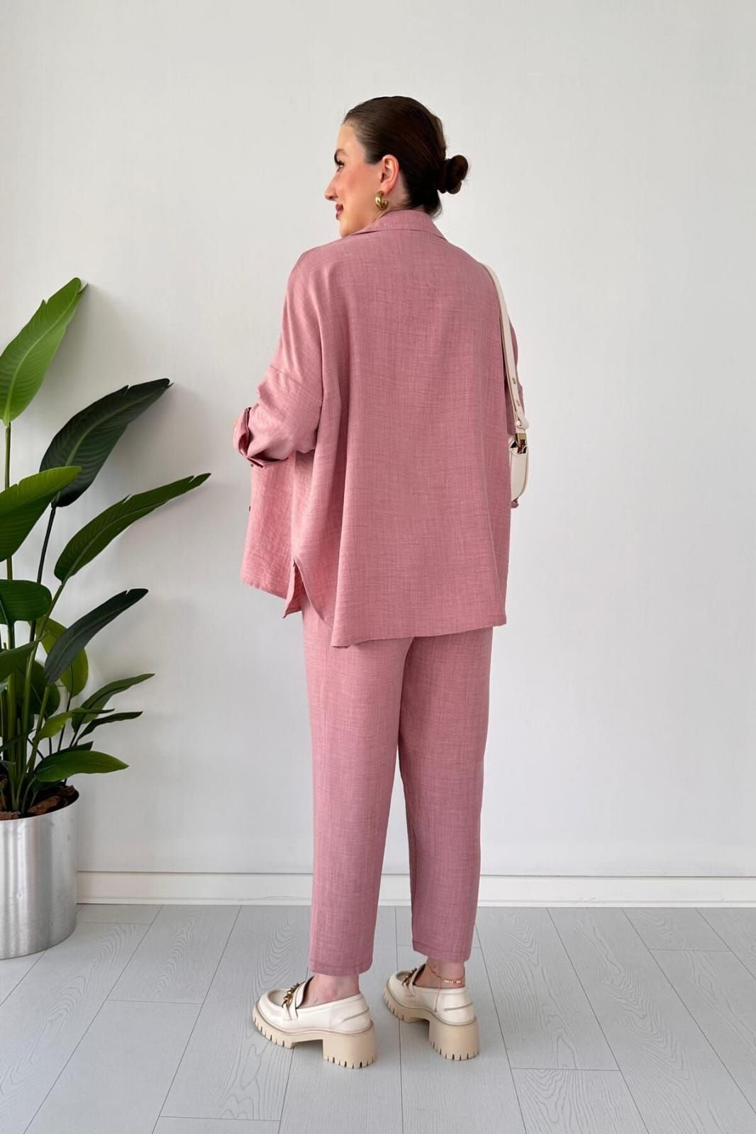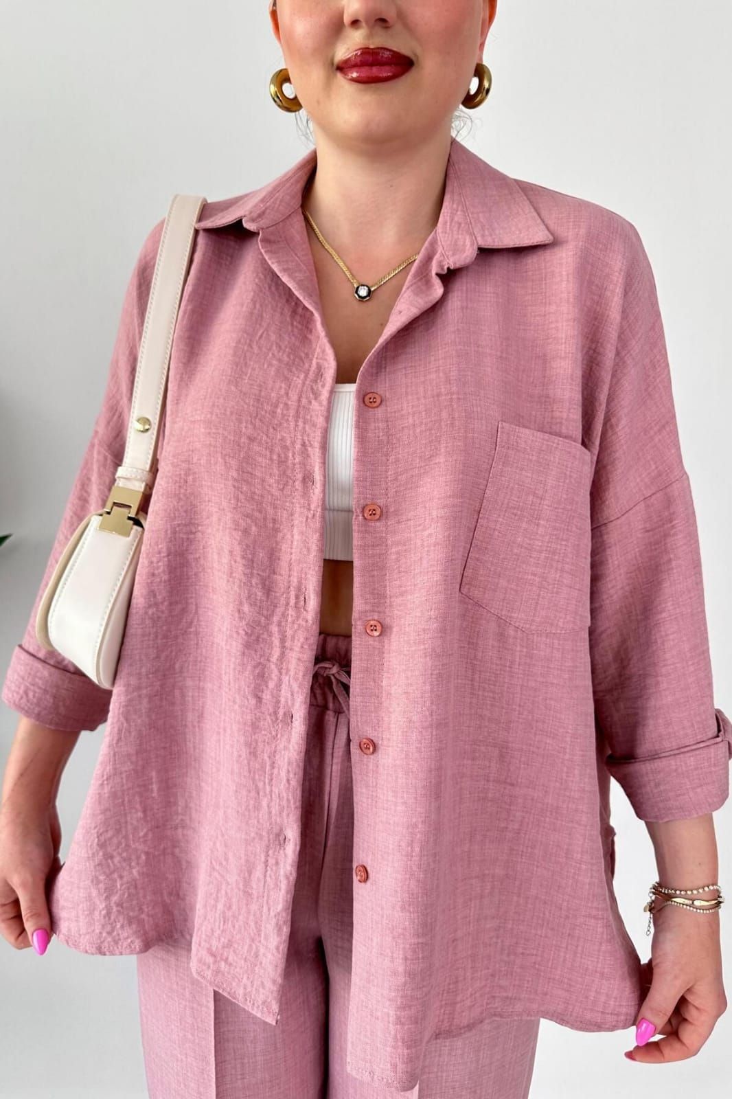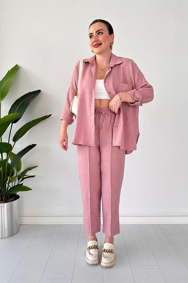 الستايل: طقم عصري من قطعتين (قميص طويل Oversize + سروال بقصة مريحة).